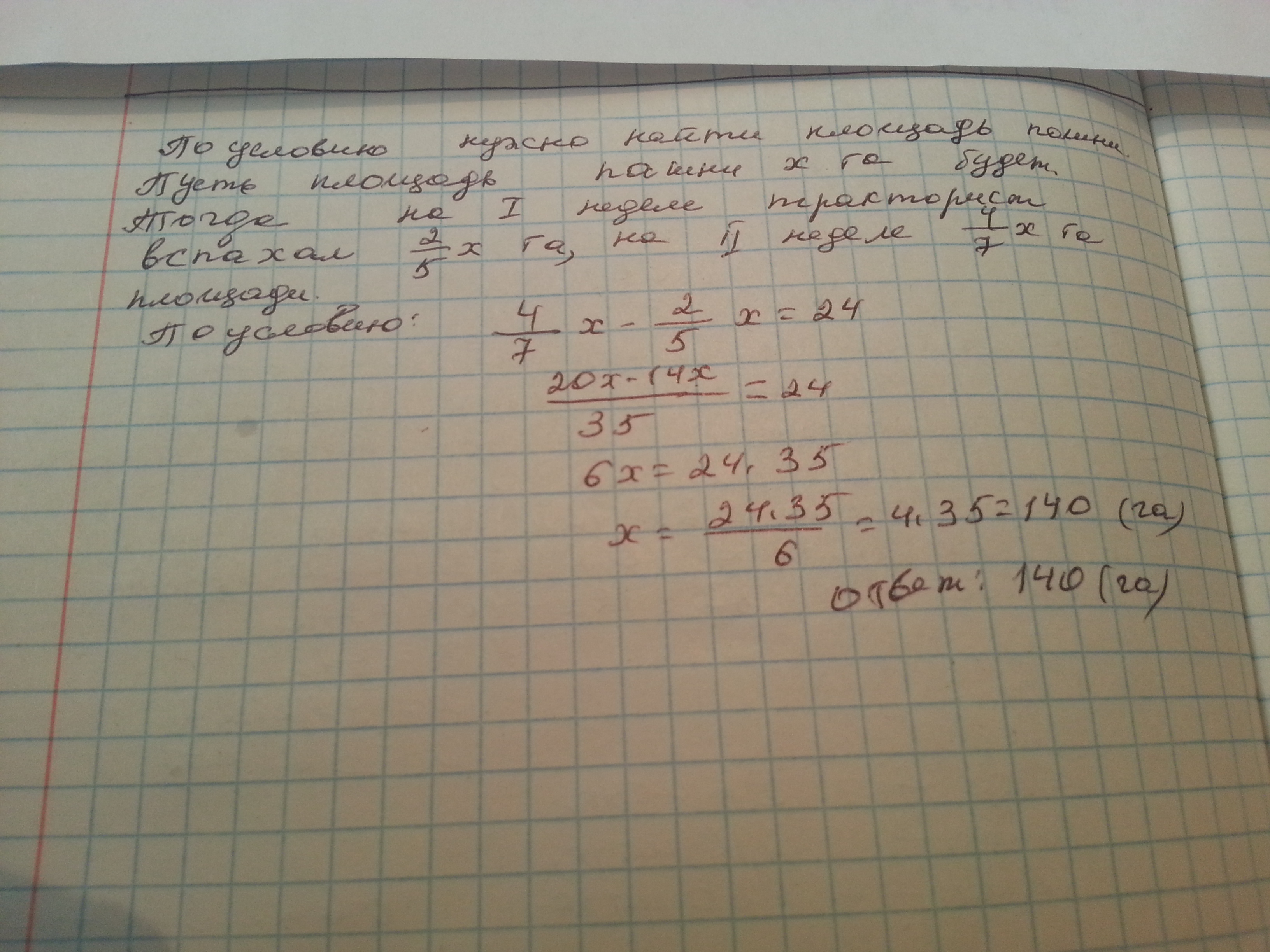 На первой неделе тракторист вспахал 2/5площади, а на второй неделе 4/7 площади пашни. На второй неделе он вспахал на 24га больше, чем на первой. Сколько га вспахал тракторист за 2 недели