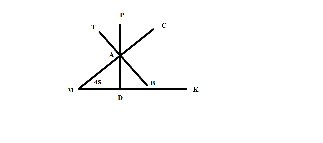 Постройте угол CMK,равный 45 градусов.Отметьте на стороне MC точку A и проведите через неё прямые,перпендикулярные сторонам угла CMK.