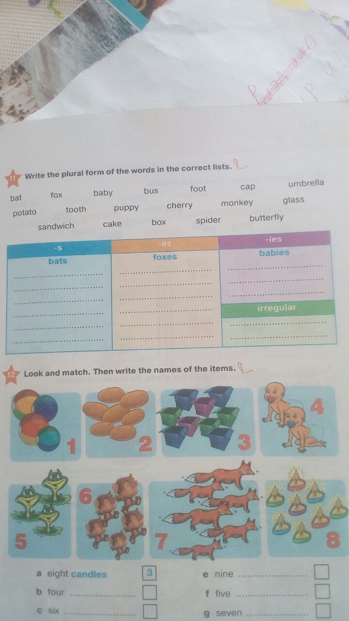 feet 4. caps 1. umbrellas 1. potatoes 2. teeth 4. puppies 3. cherries 3. monkeys 1. glasses 2. sandwiches 2. cakes 1. boxes 2. spiders 1. butterflies 3.
