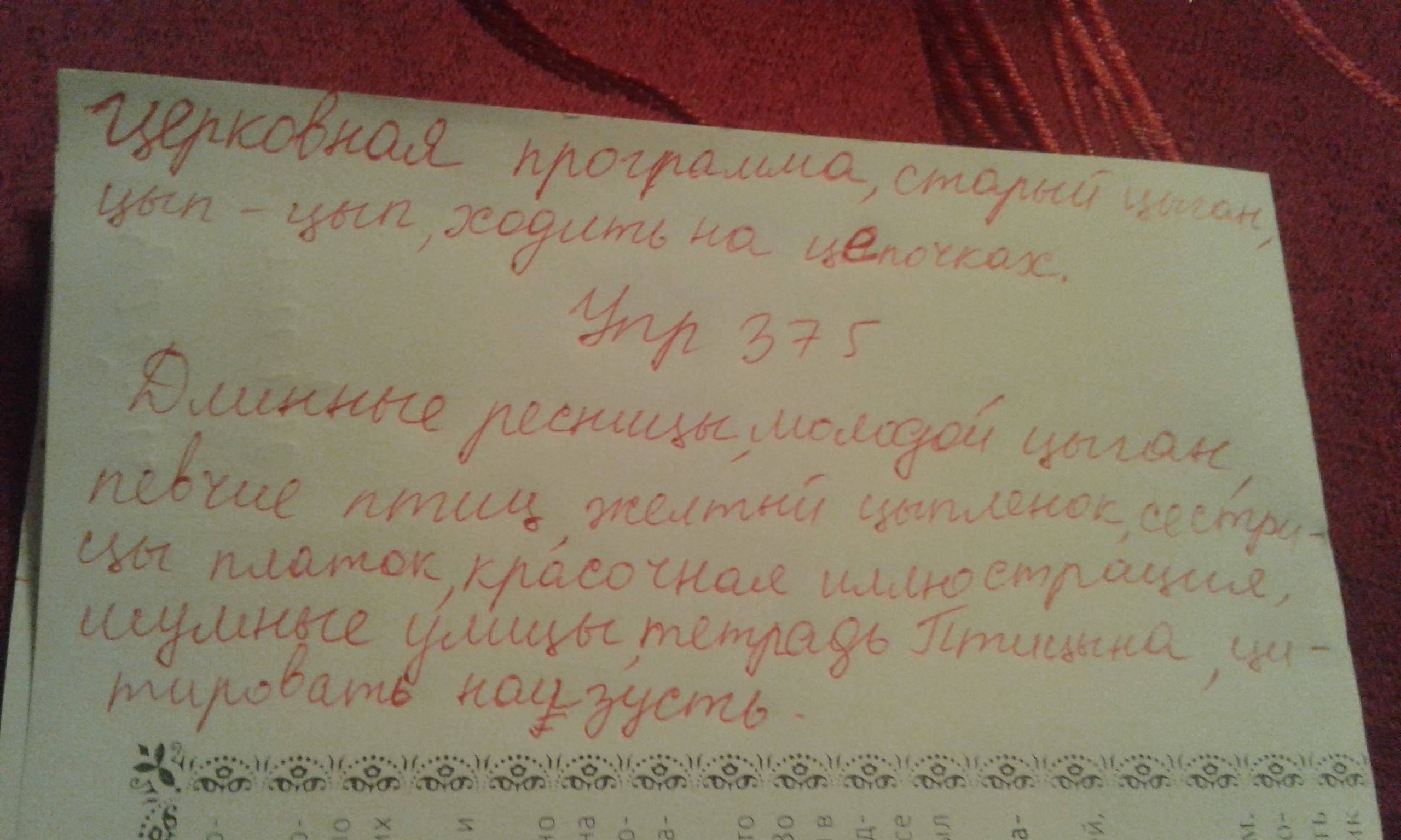 Длинные ресниц...,молодой ц...ган,певчие птиц...,желтый ц...плёнок,сесриц... платок,красочная иллюстпрац...я,шумные улиц...тетрадь Птиц...на,ц...тировать наизусть.