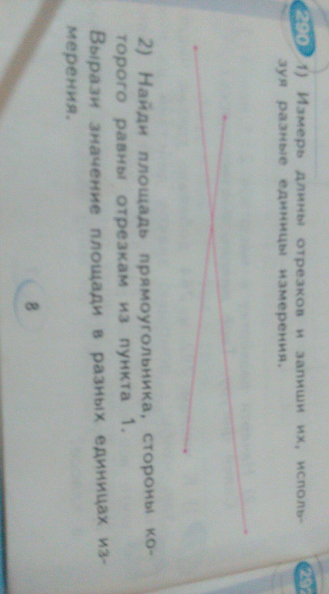 1) Измерь длины отрезков и запиши их, используя разные единицы измерения. 2) найди площадь прямоугольника, стороны которого равны отрезкам из пункта 1. Вырази значение площади в разных единицах измерения.