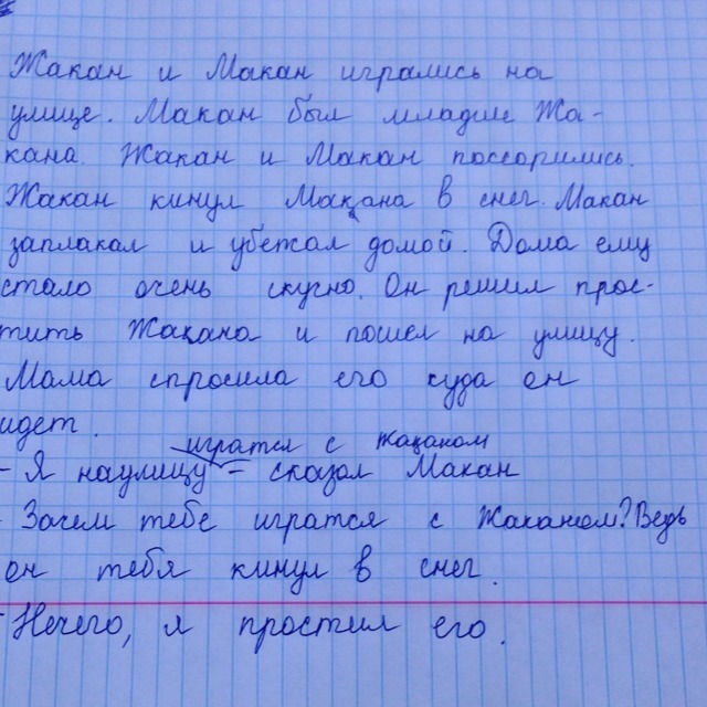 Жакан жане Макан далада ойнап журди. Макан Жаканнан кишкентай болды. Жакан мен Макан керисип калды. Жакан Маканды кардын устине лактырып жиберды. Макан жылап, уйине кетты. Уйде онын иши пысты. Ол Жаканды кеширемин деп шешим кабылдады. Анасы одан: "Сен кайда бара жатырсын?" деп сурады.