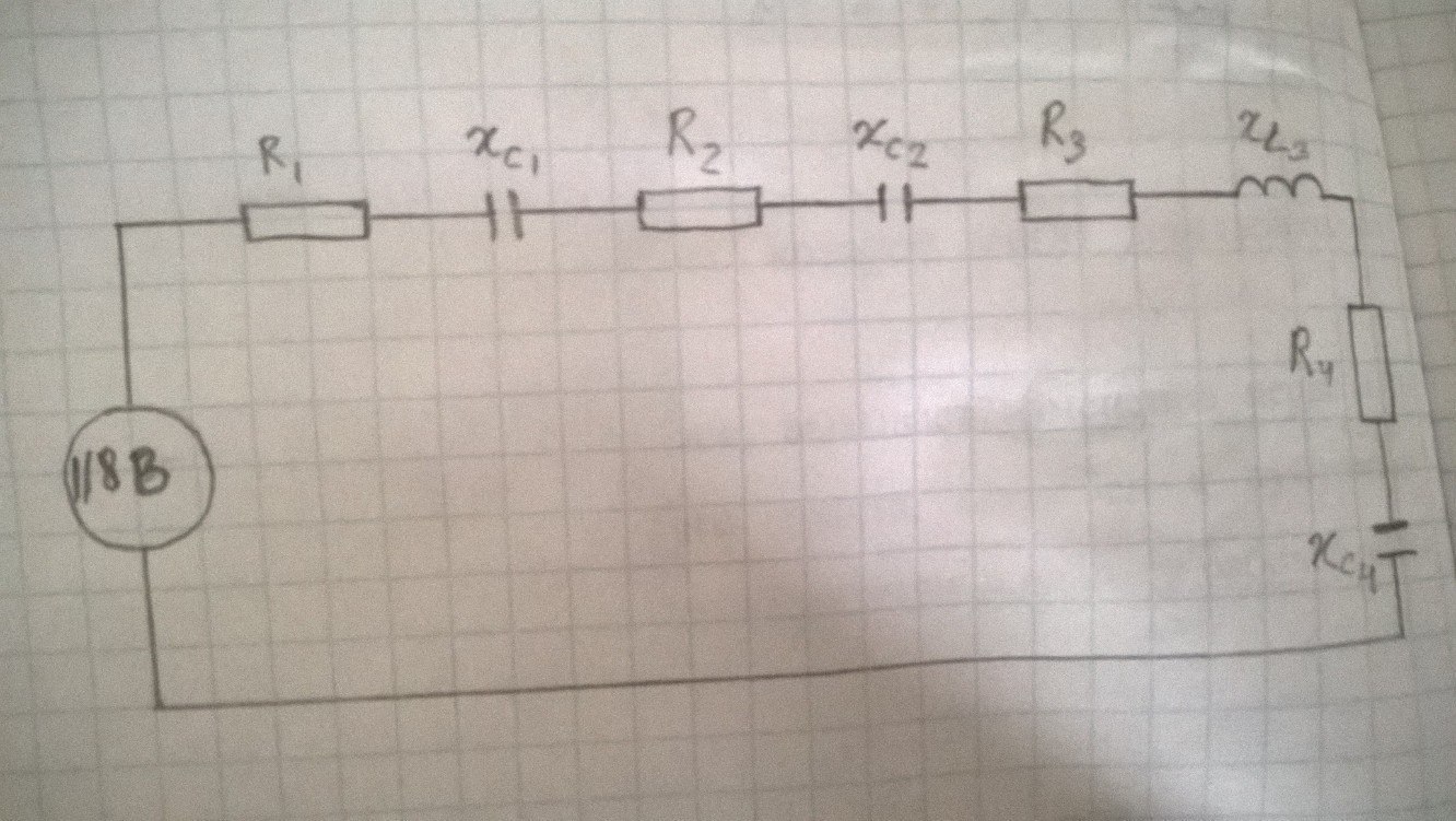 Цепь из четырёх последовательно соединённых участков присоединена к сети напряжением 118 В, сопротивление участков R₁=4 Ом, Хс₁=13 Ом, R₂=3 Ом, Хс₂=4 Ом, R₃=5 Ом, Х↓L₃=7 Ом, R₄=6 Ом, Хс₄=8 Ом.