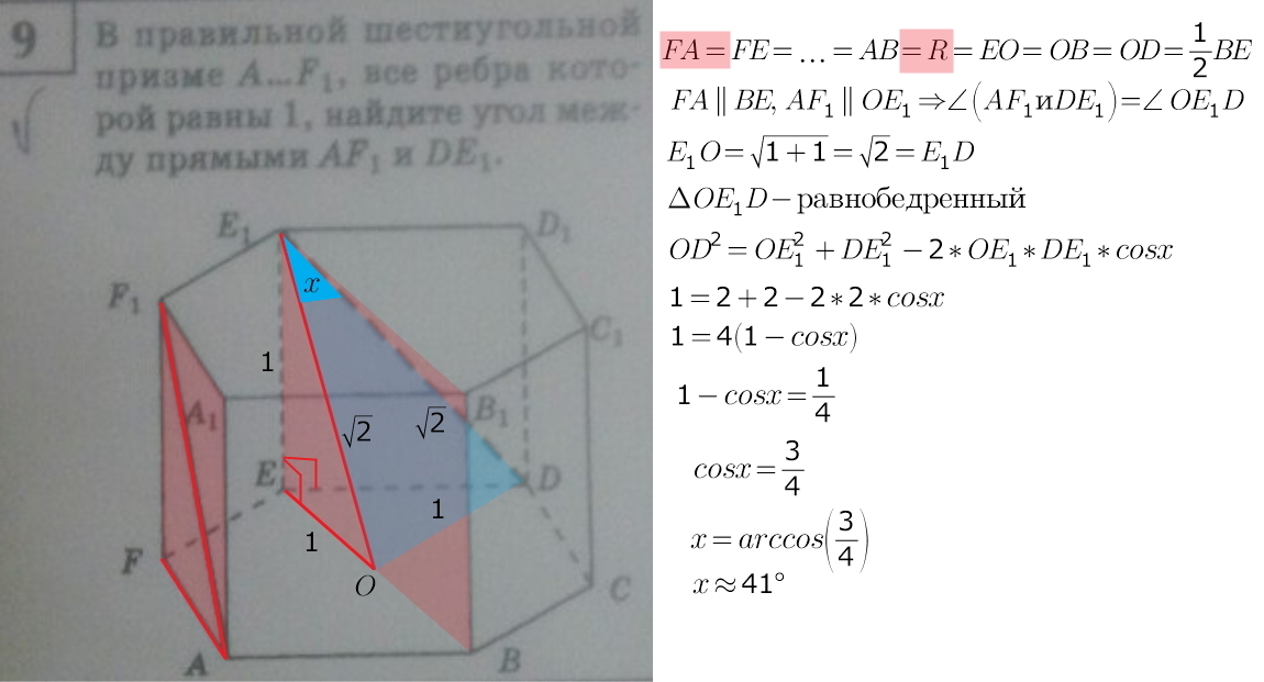 Помогите, пожалуйста. В правильной шестиугольной призме AF1 все рёбра которой равны 1 найдите угол между прямыми AF1 и DE1