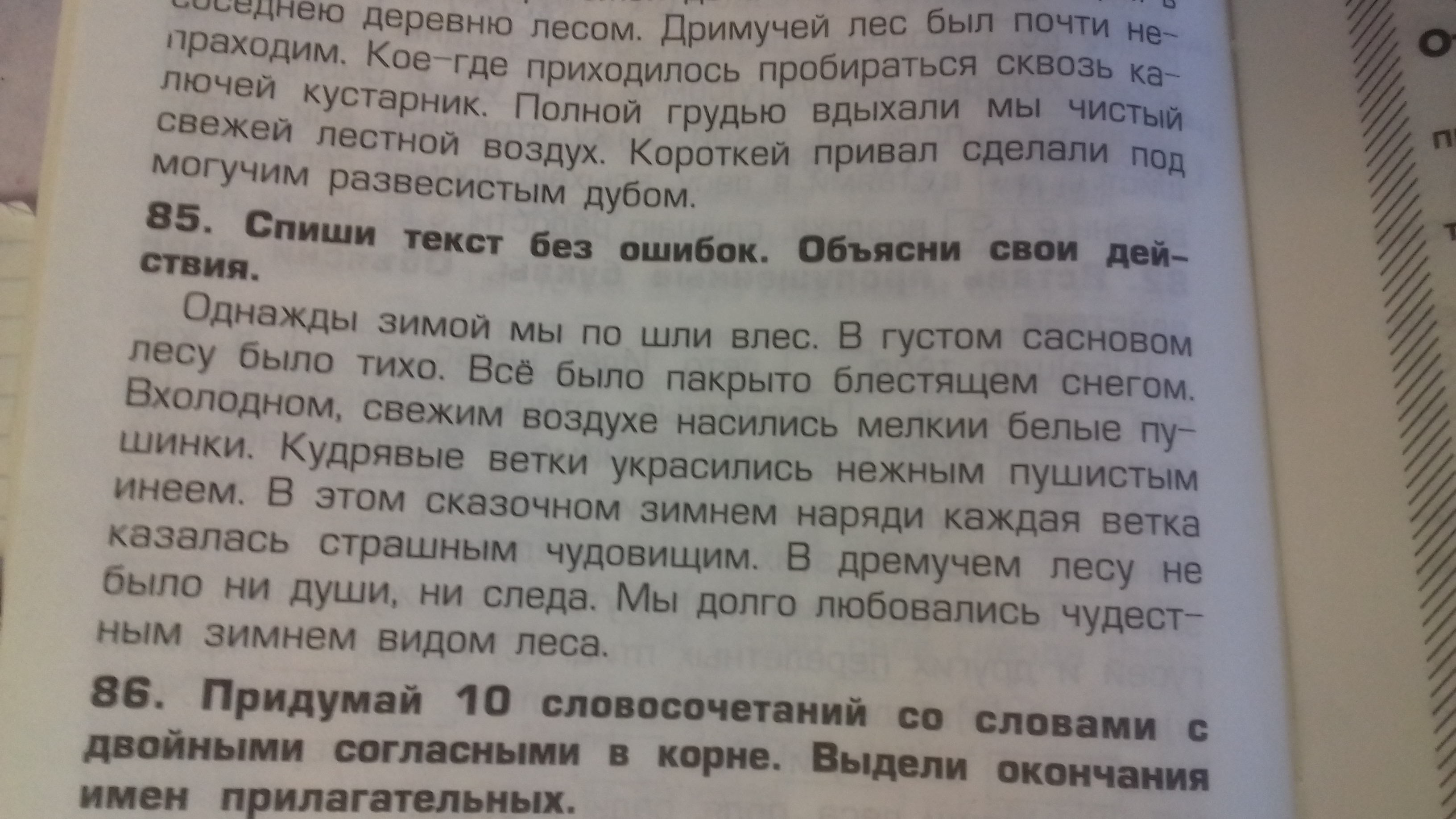 Однажды зимой мы пошли в лес. В густом сосновом лесу было тихо. Все было покрыто блестящим снегом. В холодном, свежем воздухе носились мелкие белые пушинки. Кудрявые ветки украсились нежным пушистым инеем. В этом сказочном зимнем наряде каждая ветка казалась страшным чудовищем. В дремучем лесу не было ни души, ни следа. Мы долго любовались чудесным зимним видом леса.