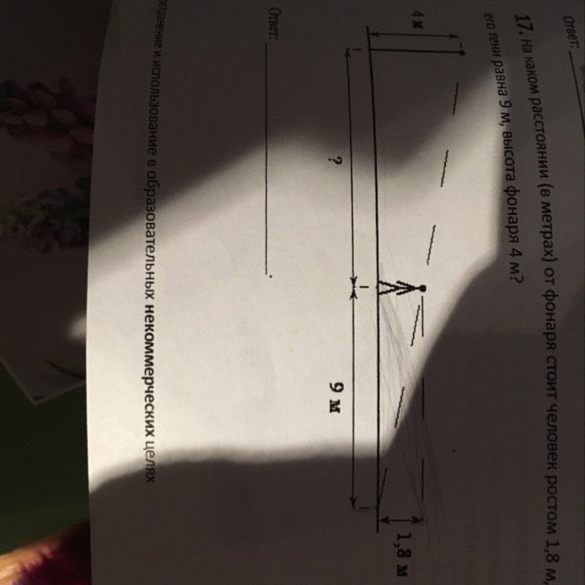 Доказываем подобие получившихся треугольников по углу и прилежащим сторонам или же по трем углам,из подобия следует, что стороны пропорциональны =) 4/1,8= х (Искомое расстояние)/9 х=20 1) 20-9 = 11 метров , так как х это расстояние вместе с тенью, а х - 9 =11 это расстояние, на котором стоит человек..