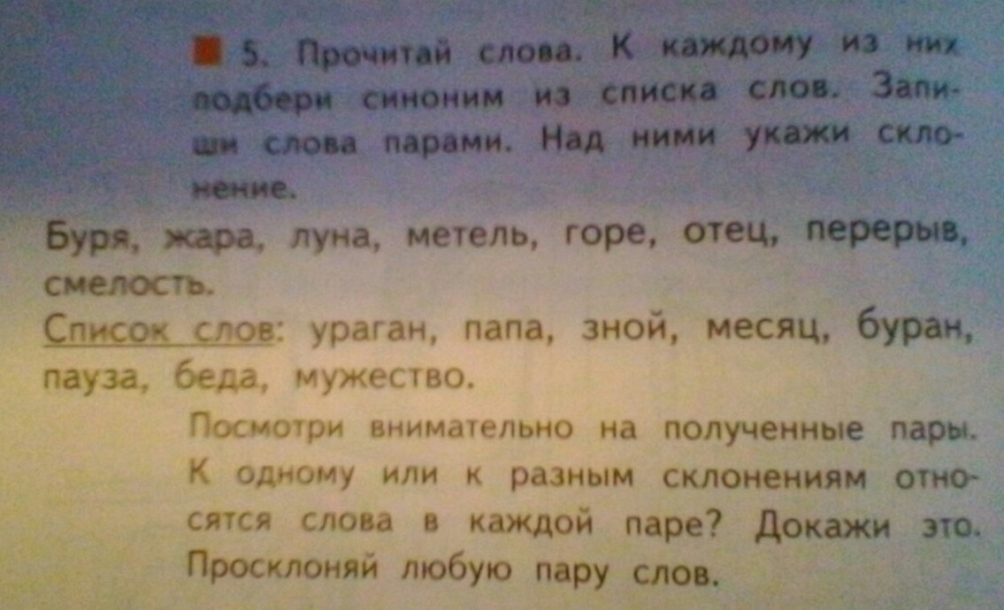 В каждой паре слова относятся к разным склонениям, например: Метель - это сущ. ж.р. 3 скл., а буран - это сущ. м.р. 2 скл..