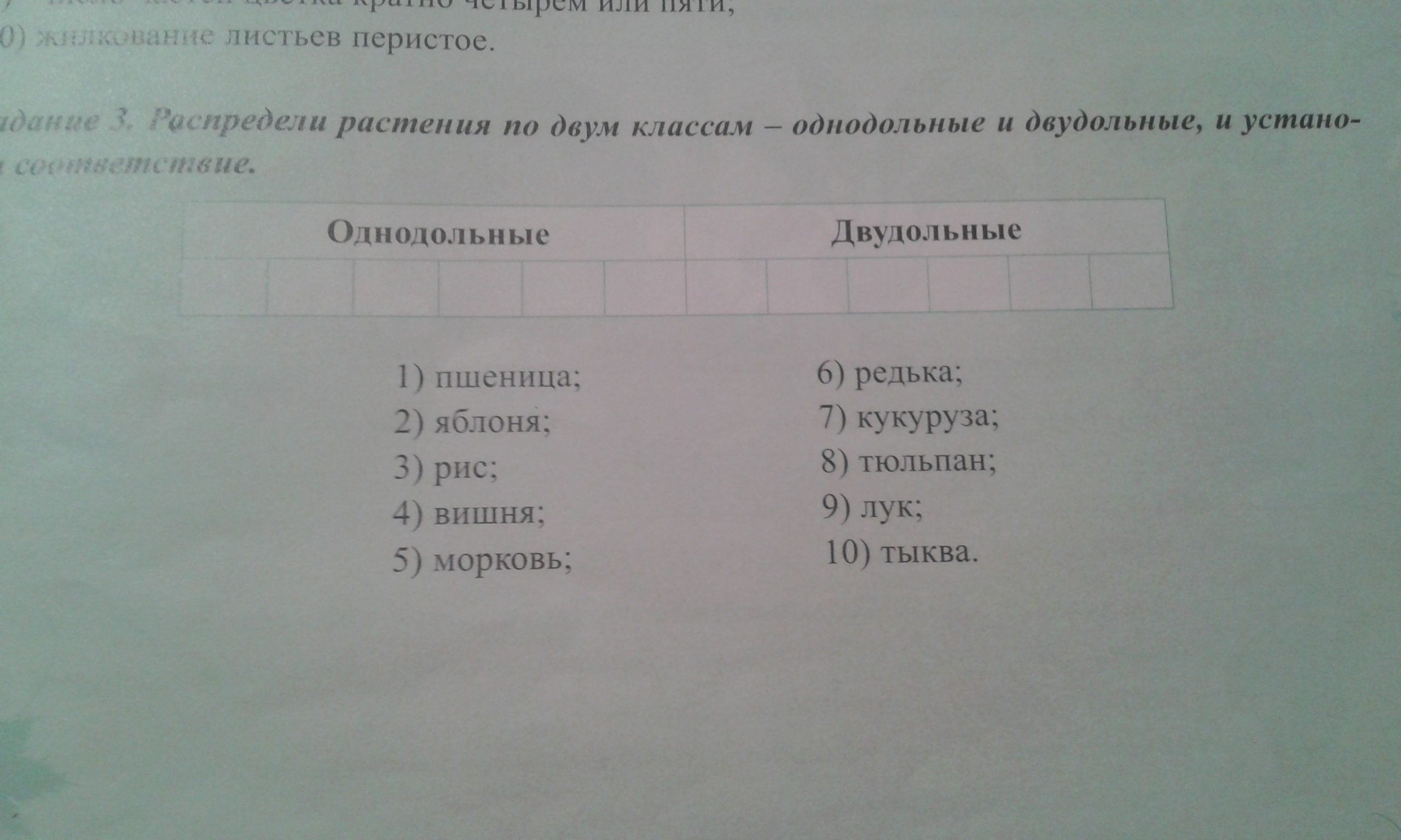 Двудольные: яблоня, вишня, морковь, редька, тыква.