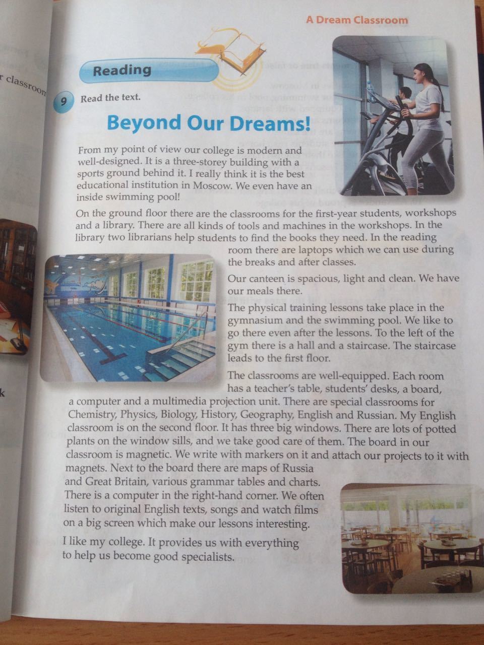 За пределами нашей мечты. С моей точки зрения наш колледж, современный и хорошо продуманная. Это трехэтажное здание с спортивная площадка позади него. Я действительно думаю, что это лучших учебных заведений в Москве. У нас даже есть внутренний плавательный бассейн!На первом этаже есть классы для студентов первого курса, мастерские и библиотека. Есть все виды инструментов и машин в мастерских. В библиотеке два библиотекарей помогают студентам найти книги, которые они нуждаются. В читальном зале есть Ноутбуки, которые мы можем использовать во время перерывов и после занятий.Наша столовая просторные, светлые и чистые. У нас там наши блюда. Физической подготовки занятия проходят в бассейне и спортзале. Мы хотели пойти туда даже после уроков. Слева от тренажерного зала есть холл и лестница. Лестница ведет на второй этаж. Классные комнаты хорошо оборудованы. В каждом номере есть стол учителя, студентов столы, доску, компьютер и блок мультимедийные проекции. Существуют специальные классы для химии, физики, биологии, истории, географии, английский и русский. Мой английский класс находится на втором этаже. Она имеет три больших окна. Есть много комнатных растений на подоконниках, и мы заботиться о них. Правление в нашем классе магнитные. Мы пишем с маркерами на него и прикрепить к нему наши проекты с магнитами. При Совете есть МАПА России и Великобритании, vorious грамматики таблицы и графики. В правом верхнем углу есть компьютер. Мы часто слушать оригинальный английский тексты, песни и смотреть фильмы на большом экране, которые делают наши уроки интересными. Мне нравится мой колледж. Это дает нам все, чтобы помочь нам стать хороших специалистов