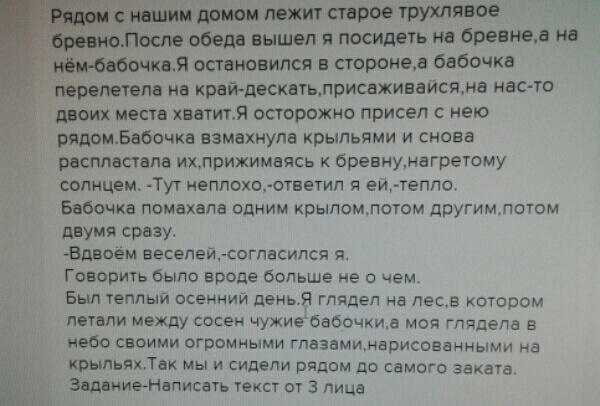 Рядом с ихним домом лежит старое трухлявое бревно. после обеда вышел он посидеть на бревне, а на нем бабочка. он остановился в стороне, а бабочка перелетела на край - дескать, присаживайся,на их - то двоих места хватит. он осторожно присел с ней рядом. бабочка взмахнула крыльями и снова распластала их, прижимаясь к бревну, нагретому солнцем. - тут не плохо, - ответил он ей, - тепло. бабочка помахала одним крылом, потом другим, потом двумя сразу.