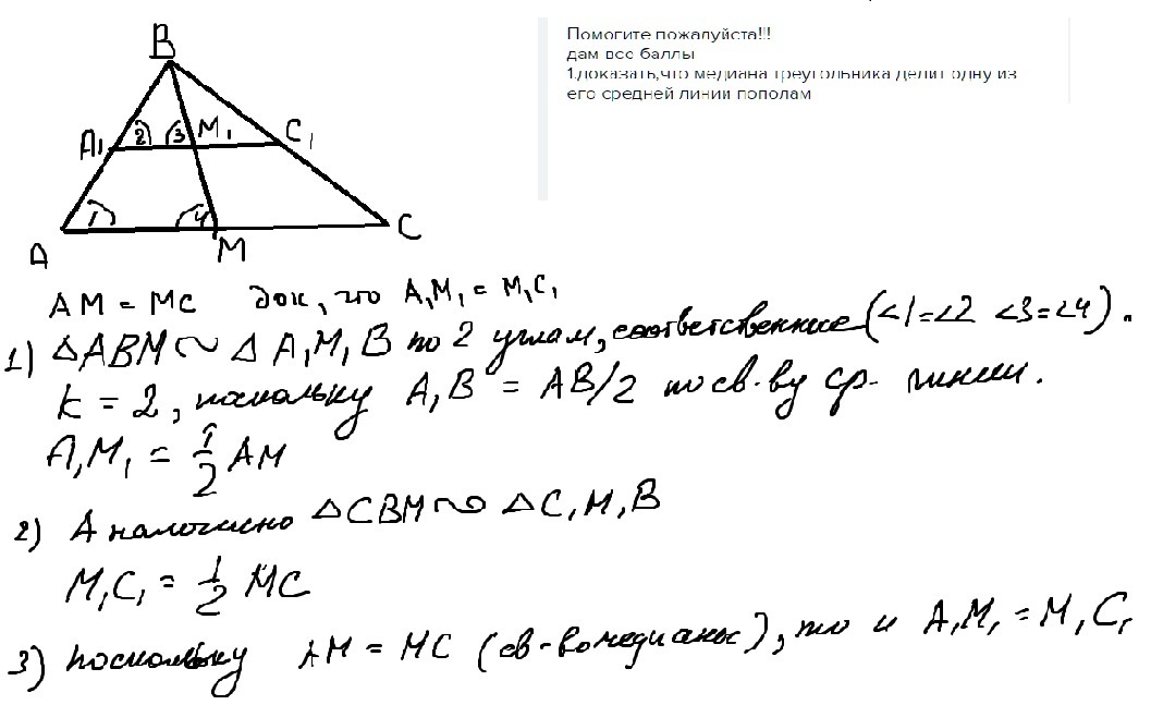 1.доказать,что медиана треугольника делит одну из его средней линии пополам