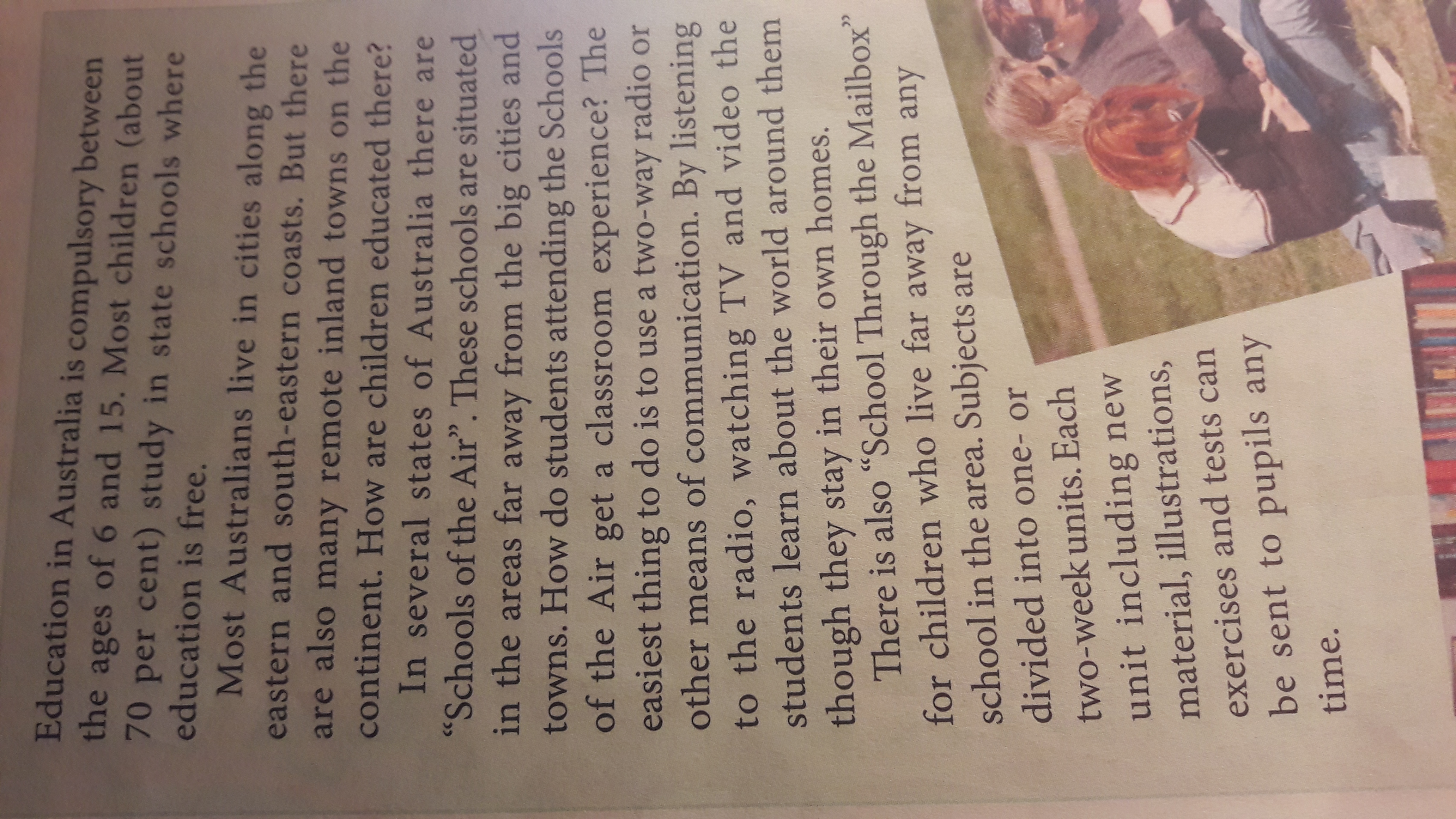 Образование в Австралии является обязательным в возрасте от 6 до 15. Большинство детей (около 70 процентов) учатся в государственных школах, где образование является бесплатным. Большинство австралийцев живет в городах вдоль восточного и юго-восточного побережья. Но есть также много отдаленных внутренних городов на континенте. Как дети образованные там? В некоторых штатах Австралии существуют "Школы Воздуха". Эти школы расположены в районах, вдали от крупных городов и населенных пунктов. Как студенты и слушатели школ Воздуха получить опыт в классе? Проще всего сделать, это использовать двустороннюю радиосвязь или другие средства связи. Слушая радио, телевидением и видео студенты узнают о мире вокруг них, хотя они остаются в своих собственных домах. Существует также "Школа Через почтовый ящик" для детей, которые живут далеко от любой школы в этом районе. Субъекты делятся на одно- или двухнедельные единиц. Каждый блок включает в нового материала, иллюстраций, упражнений и тестов могут быть отправлены ученикам в любое время.