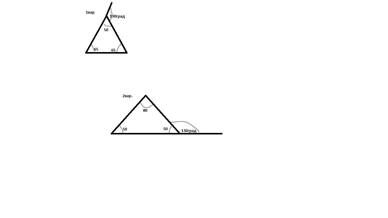 1) внешний угол при основании р/б тр =130*, тогда внутренний угол при основании =180-130=50* ( по опред внешнего угла)