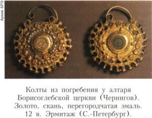 Во многих землях археологи находили клады, включающие колты. Такой была и находка под Черниговом. Здесь они солнцевидной формы. Круглые колты изготовлены из золота, имеют лучевую кайму и дужку. С ее помощью украшения, которые заменяли женщинам серьги, подвешивались кольцами или лентами к головному венцу. Особенностью черниговских непарных колтов стала их отделка. Они украшены в центре эмалевым щитком, на одном из которых изображены две птицы, а на другом - дерево. Для эмали древний мастер использовал белое, зеленое и золотистое стекло. Вокруг щитков обнизь из речного жемчуга. Еще один орнаментальный круг представляет собой скань – узор из тонкой металлической нити.