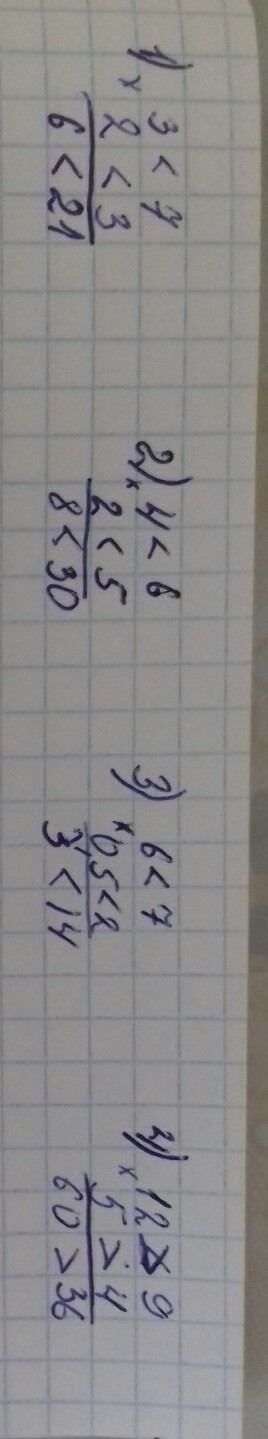 Перемножьте почленно неравенства: 1) 3<7 и 2<3; 2) 4<6 и 2<5; 3) 6<7 и 0,5<2; 4) 12>9 и 5>4