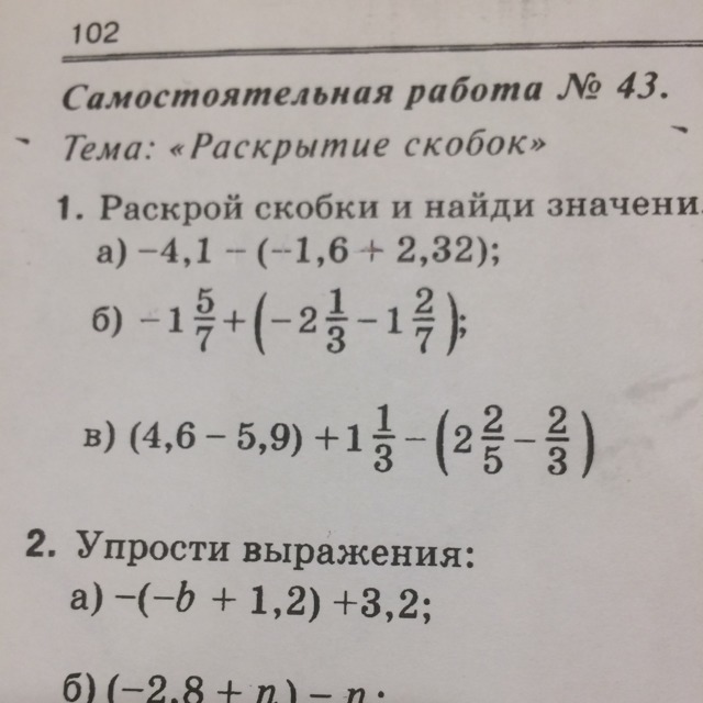 в)(4,6-5,9)+1 1/3-(2 2/5-2/3)=-1,3+1 1/3-2 2/5+2/3=-1,3+1 1/3+2/3-2 2/5 = -1,3+2-2 2/5=-1,3-2/5=-1,3-0,4=-1,7