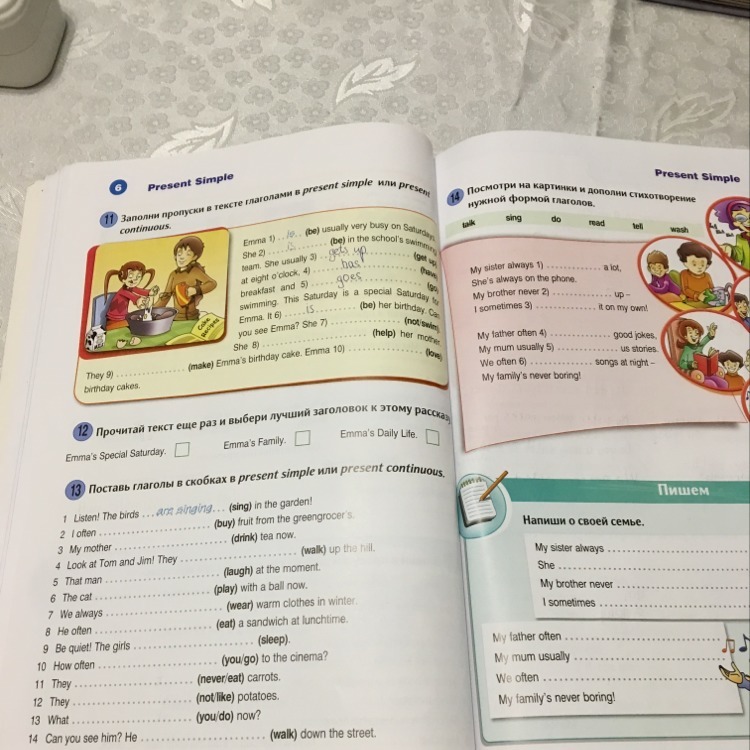 #11 7) doesn't swim 8) helps 9) make 10) loves #12 там 1 #13 2) buy 3) is drinking 4) are walking 5) is laughing 6) is playing 7) wear 8) eates 9) is sleeping 10) do you go 11) are never eat 13) are you doing 14) is walking.