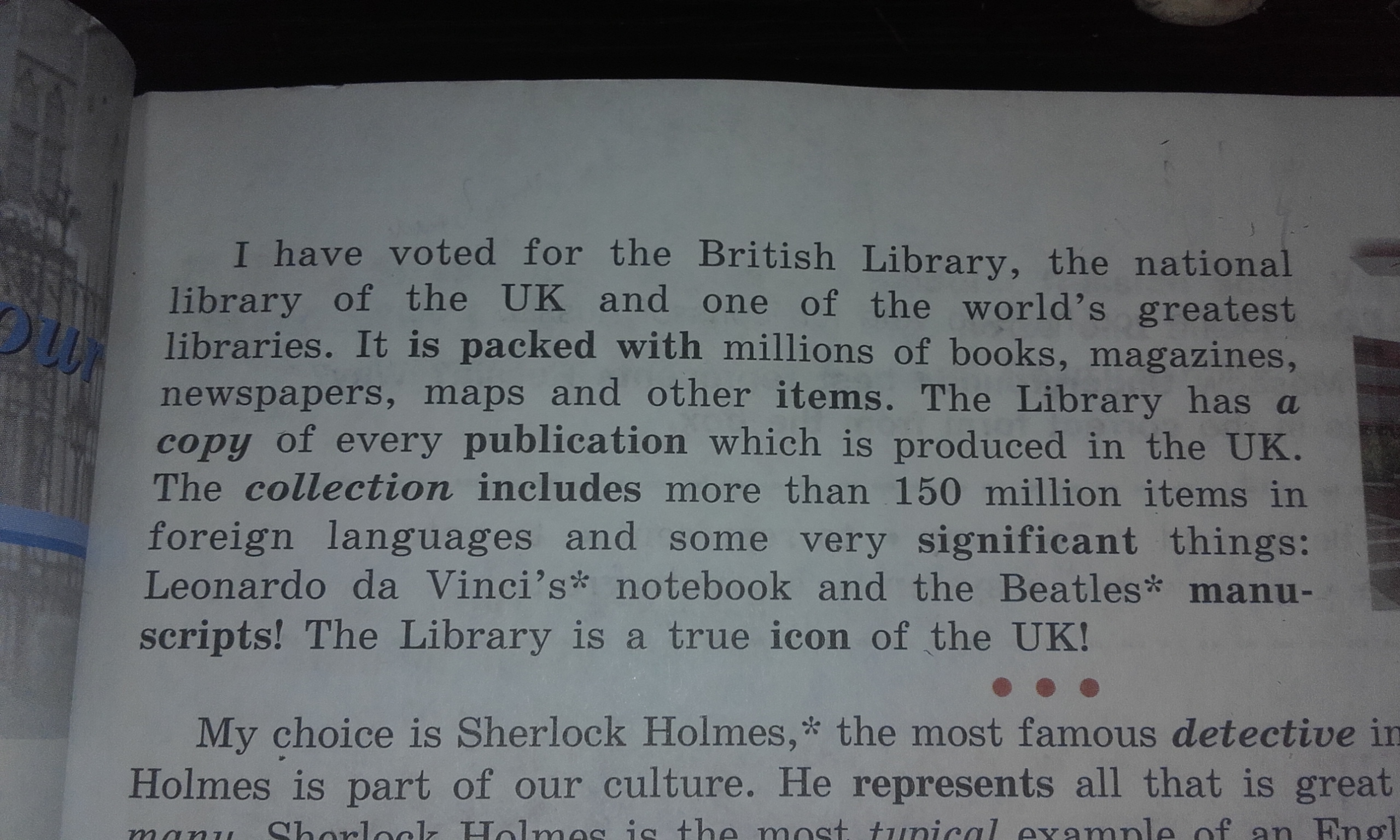 Я голосовал за британскую библиотеку, национальную библиотеку соединенного королевства и одну из лучших библиотек мира. Она заполнена миллионами книг, журналов, газет, карт и других вещей. Библиотека содержит копию каждой публикации сделанной в соединенном королевстве. Коллекция включает в себя более 150 миллионов предметов на зарубежных языках и некоторых значимые вещи: тетрадь леонардо да винчи и манускрипт битлс. Библиотека настоящее изображение соединенного королевства.
