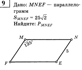 Из вершины М опускаем перпендикуляр на FS. Получаем прямоугольный треугольник MNF и находим MN (N- точка пересечение с FS) .Легко заметить что острые углы равны 45°. MN=5×Sin45=5×√2/2. S=FS×MN. FS=25√2:5√2/2=10. Тогда периметр =(5+10)×2=30. Ответ:30