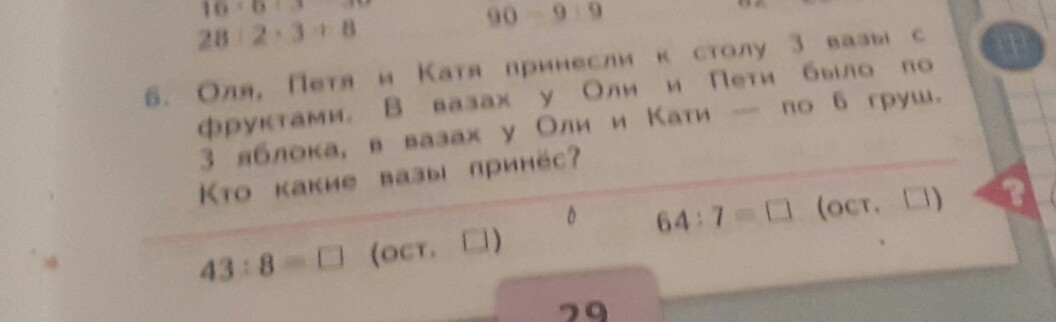 Оля Петя и Катя принесли к столу 3 вазы с фруктами . В вазах у Оли и Пети было по 3 яблока в вазах у Оли и Кати по 6 груш кто какие вазы принёс