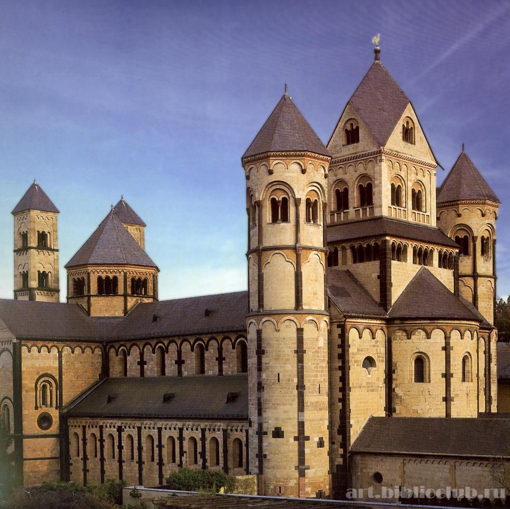 Лаахское аббатствоЛаахское аббатство Святой Марии — средневековый немецкий монастырь, находящийся на юго-западном берегу Лаахского озера, в горах Айфель.Собор Марии Лаах — одно из наиболее сохранившихся и примечательных зданий в романском стиле в Германии. Это связано прежде всего с тем, что собор практически не перестраивался в более позднее время. Изменения в готическом стиле (заостренные навершия башен) и барокко (расширенные окна бокового нефа) были убраны в ходе реставрационных работ в XX веке. Несмотря на свой возраст, здание выглядит гармоничным и полностью соответствующим своему времени.