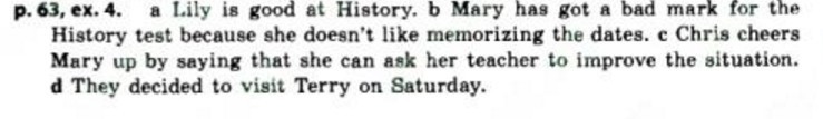 1. Лили хороша в истории. 2. Мэри получила плохую оценку по тест истории потому что ей не нравиться запоминать даты. 3. Крис подбадривает Мэри говоря что она может попросить учителя улучшить ситуацию. 4. Они приняли решения навестить Терри в субботу.