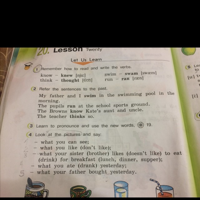 В первом упражнение записаны слова know-knew. swim-swam и так далее первое слово это настоящее время второе слово прошлое. В упражнении надо все слова выделеные поставить в прошлом времени просто.