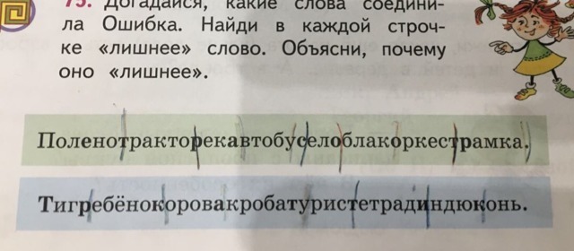 в первом мб перед облаком слово ел, а лишнее оно потому что ел это глагол , а все остальное это имя существительное (хотя сей вариант думаю не верен) оркестр или рамка лишнее т.к. в селе где может быть река, трактор, полено , оркестра ну никак не может быть...ну а если в 2-м то тетради лишние, т.к. невоодушевленный предмет
