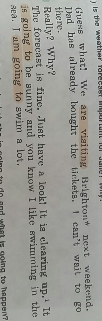 Угадай, что! Мы поедим в Брайтон в следующие выходные. Папа уже купил билеты. Я не в терпении, чтобы поехать туда.В самом деле? Зачем?Прогнозы отличные. Просто взгляните! Это чистое небо. Там будет солнечно, и вы знаете, что я люблю плавать в море. Я буду много плавать.