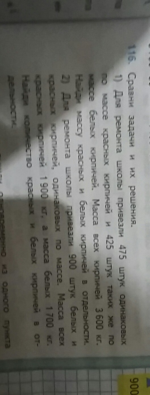 3. Найдем массу белых кирпичей. 4×475=1900 килограмм.