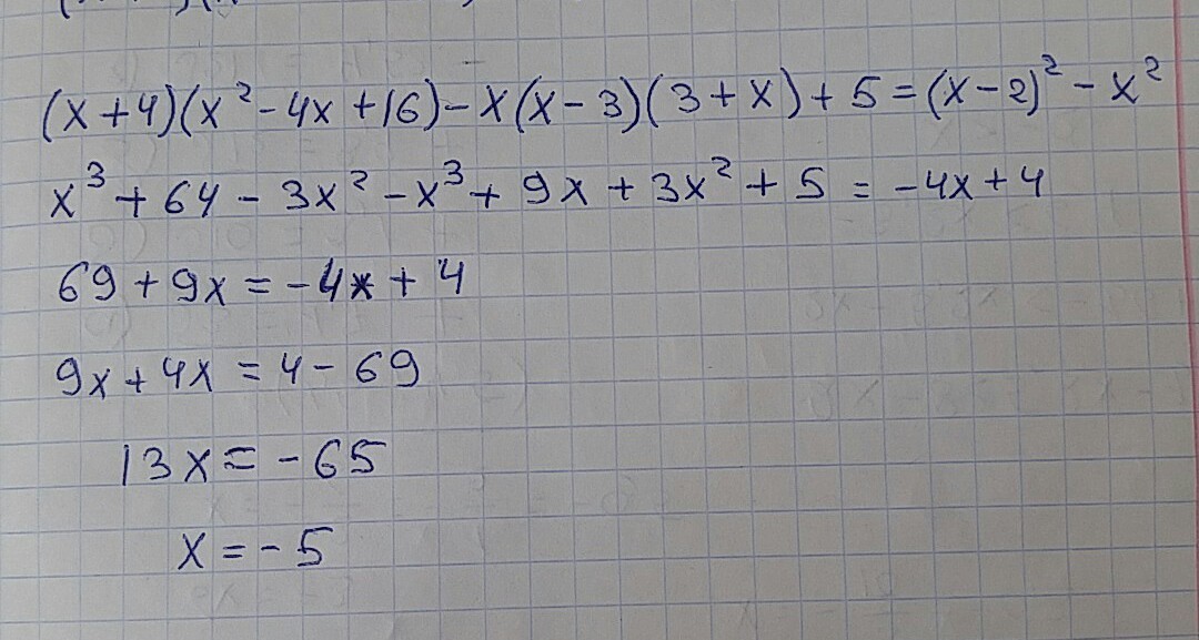 (x+4)*(x^2-4x+16)-x*(x-3)*(3+x)+5=(x-2)^2-x^2