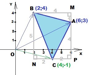 в декартовой системе координат даны точки А(6;3) и B(2;4). Точка С такова, что ОС=ОА-ОB. Найдите площадь треугольника АBC