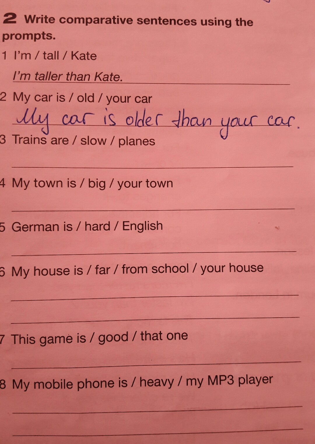 Trains are slower than planes ( поезда медленнее чем самолеты ); My town is biger than your town;German is harder than English; My house is farer than from school than your house; This game is gooder than that one; my mobile phone is heavyer than my MP3 player.