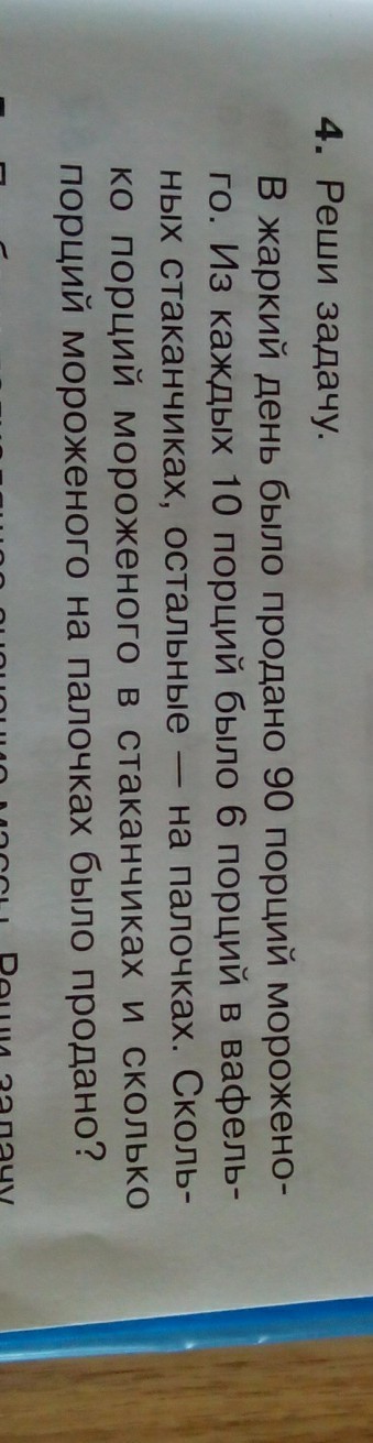 В жаркий день было продано 90 порций мороженого. Из каждых 10 порций было 6 порций в вафельных стаканчиков,остольные -на палочках. Сколько порций мороженого в стаканчиках и сколько порций мороженого на палочках было продано ?
