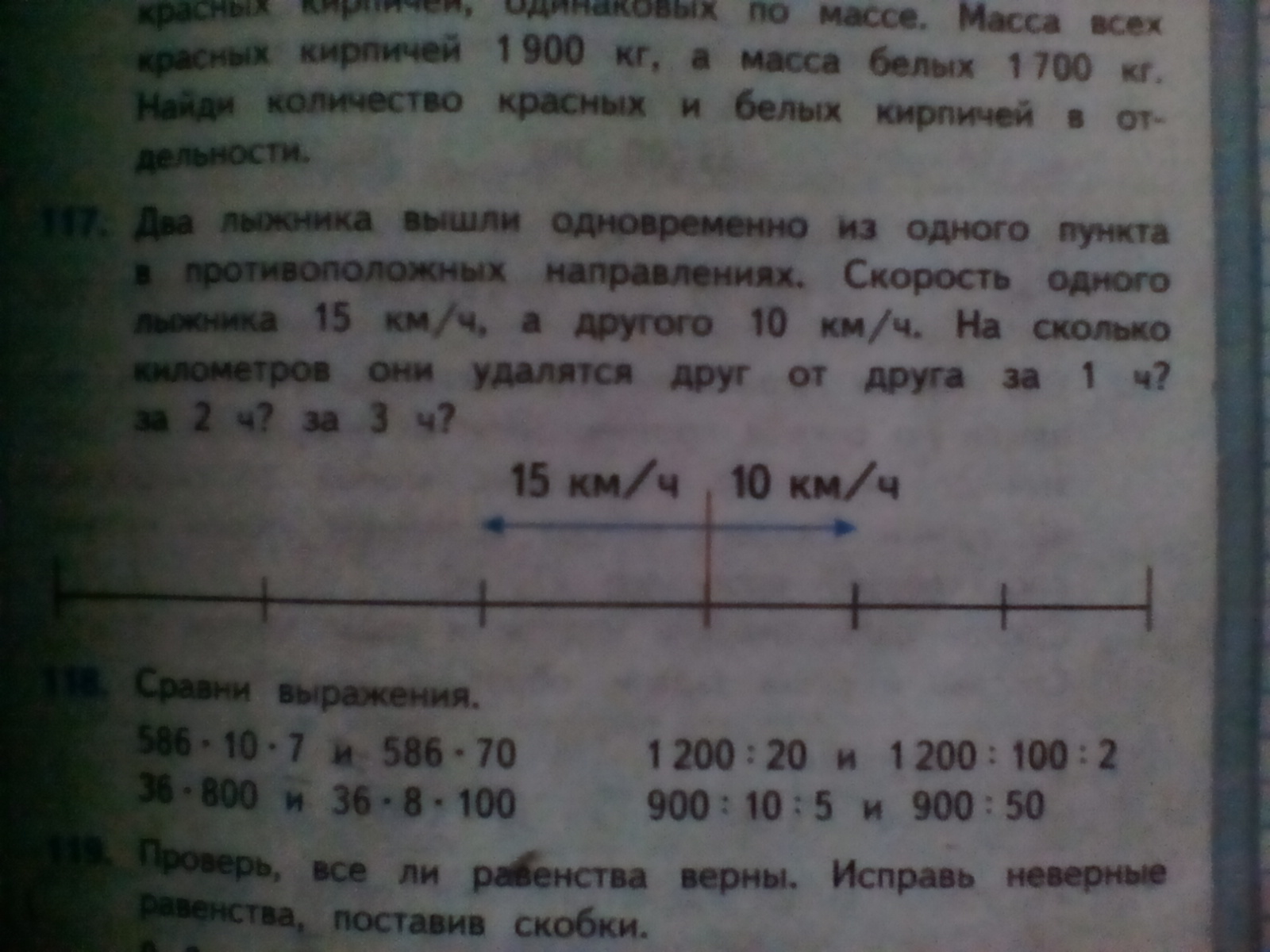 Два лыжника вышли одновременно из одного пункта в противоположных направлениях. Скорость одного лыжника 15 км/ч, а другого 10км/ч. На сколько км они удалятся друг от друга за 1 ч? за 2ч? за 3 ч?