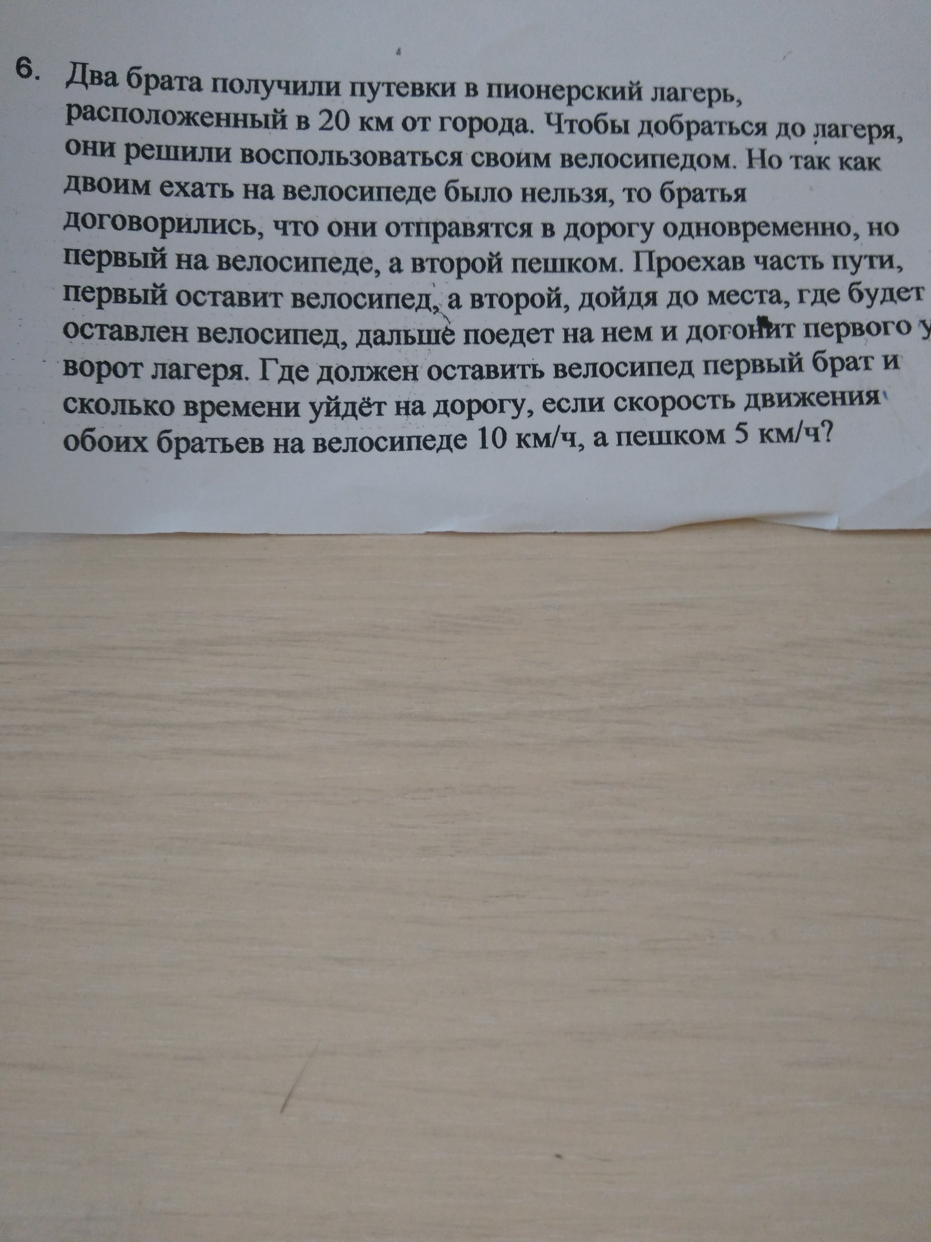 Два брата получили путёвки в пионерский лагерь,расположенный в 20км от города.Чтобы добраться до лагеря, они решили воспользоваться своим велосипедом.Но так как двоим ехать на велосипеде было нельзя, то братья договорились, что они отправятся в дорогу одновременно, но первый на велосипеде,а второй пешком.Проехав часть пути,первый оставит велосипед,а второй ,дойдя до места ,где будет оставлен велосипед,дальше поедет на нём и догонит первого у ворот лагеря.Где должен оставить велосипед первый брат и сколько времени уйдёт на дорогу,если скорость движения обоих братьев на велосипеде 10км/ч,а пешком 5км/ч?