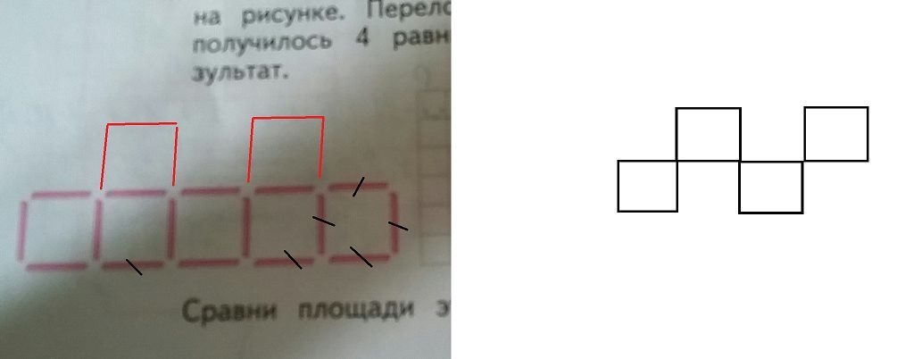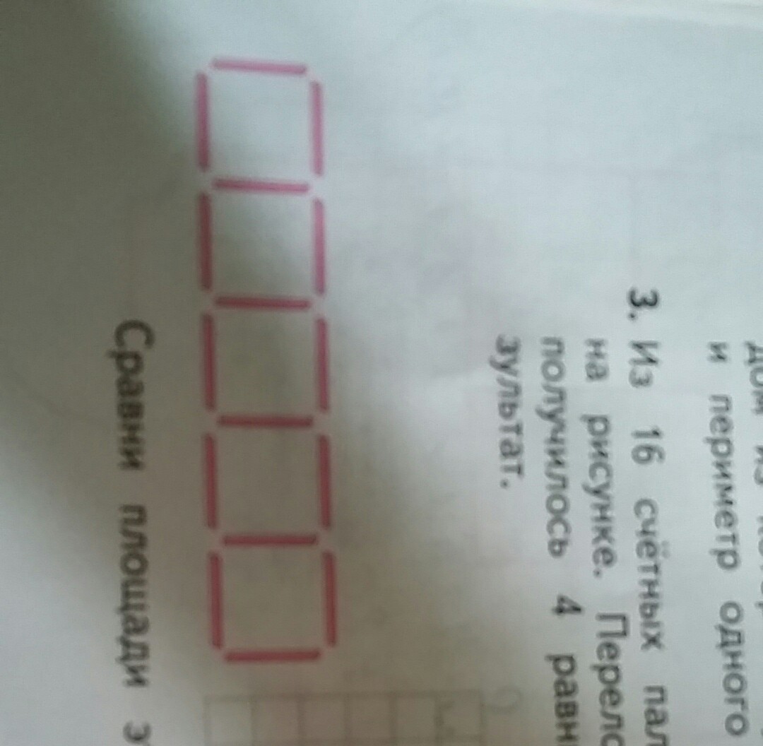 из 16 счетных палочек выложи фигуру,как на рисунке. переложи 6 палочек так,чтобы получилось 4 равных квадрата. Зарисуй результат. Сравни площади этих двух фигур.