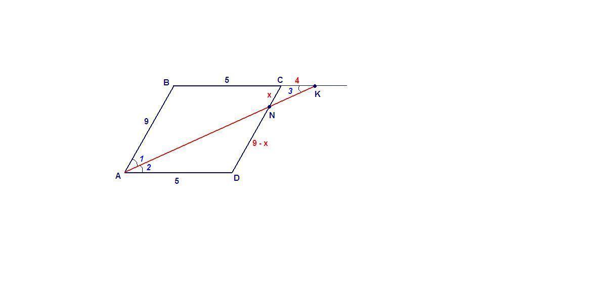 Биссектриса угла А параллелограмма АВСD пересекает сторону CD в точке N. Найдите NC, если AD=5, CD=9.