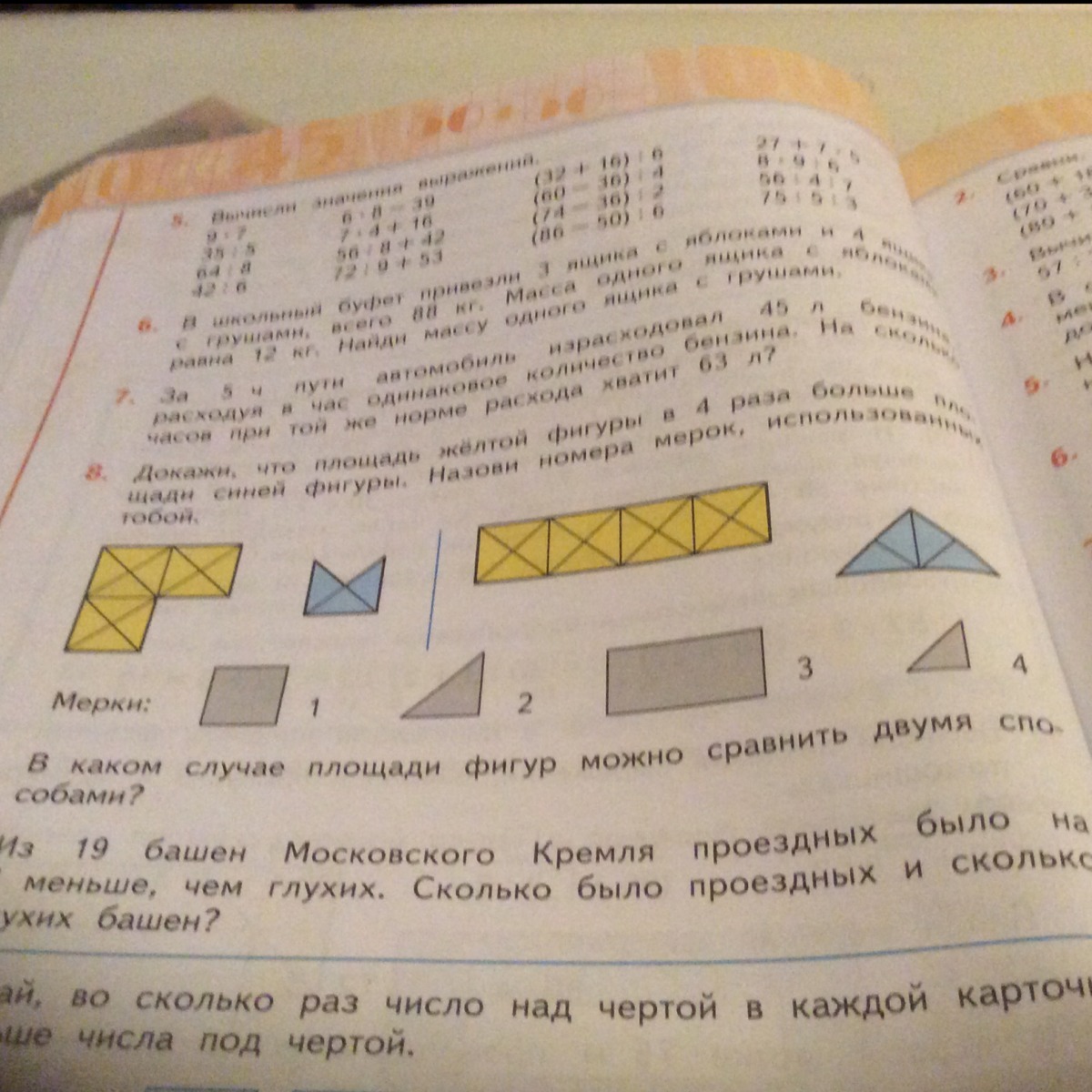 Докажи что площадь жёлтой фигуры в 4 раза больше площади синей фигуры. Назови номера мерок, использованных тобой. В каком случае площади фигур можно сравнить двумя способами?