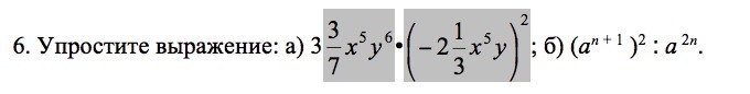 а) 3*3/7х5у6*(-2*1/3х5у)2=24/7х5у6*(-7/3х5у)2=24/7х5у6*(49/9х10у2)= 56/3х15у8=18*2/3х15у8 * - знак умножения