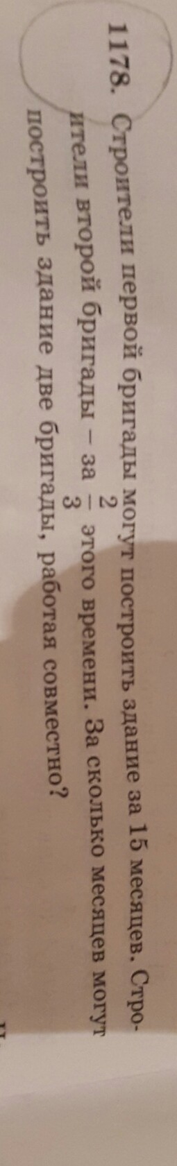 1)15:3 умножить на 2 получается 10-за столько месяцев построит 2 бригада здание.2)1/15 получается 1/15 3)1/10 получается 1/10 4)1:15+1:10 получается 5/30 получается 1:6.5)1 умножить на 1:6 получается 6.Ответ:За 6 месяцев