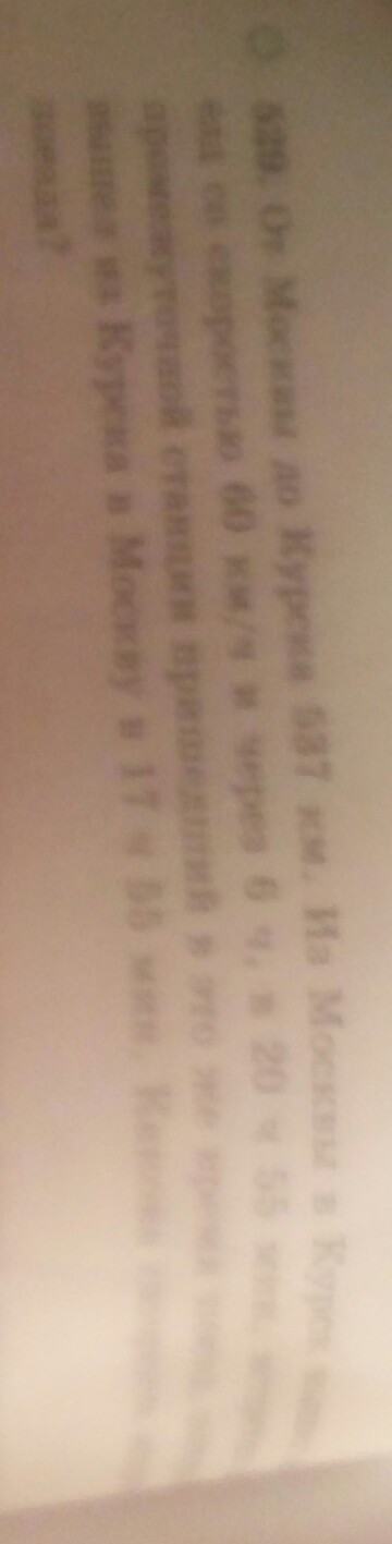помогите срочно пожалуйста!!!номер 529 От Москвы до Курска 537 км. Из Москвы в Курск вышел поезд со скоростью 60 км/ч и через 6 ч, в 20 ч 55 мин, встретил на промежуточной станции пришедший в это же время поезд, который вышел из Курска в Москву в 17 ч 55 мин. Какова скорость второго поезда?