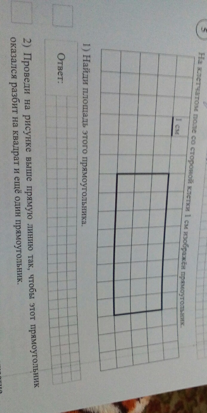 На клеточном поле со стороной клетки 1 сантиметр изображён прямоугольник Найди площадь этого прямоугольника проведи на рисунке выше прямую линию так чтобы этот прямоугольник оказался разбит на квадрат и еще один прямоугольник. ПОМОГИТЕ ПОЖАЛУЙСТА!!!. ЗАРАНЕЕ СПАСИБО