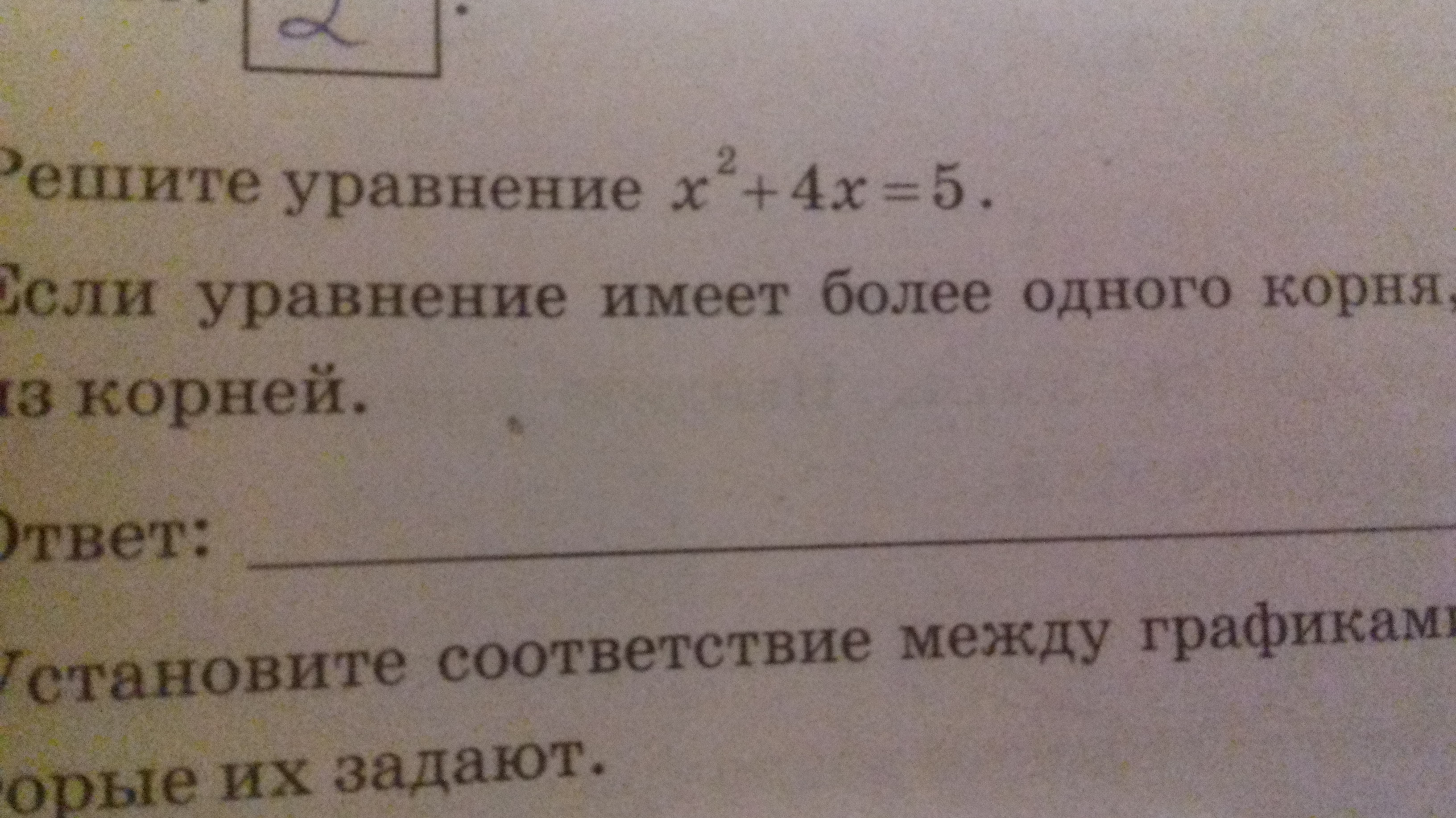 x^2+4x=5; x^2+4x-5=0; D= 16-4*1*(-5)=36; x1=(-4-6)/2; x2=(-4+6)/2; x1=-5,x2=1.Ответ: x1=-5, x2=1.