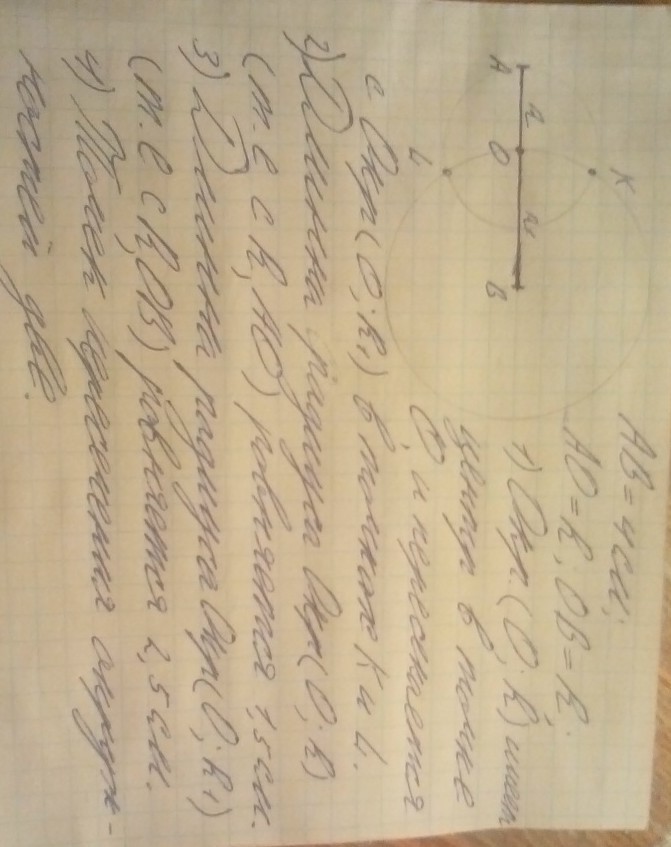 Начерти отрезок AB длиной 4 см. Поставь точку О на отрезке. Проведи две окружности с центром в этой точке и радиусами, равными отрезками ОА и OB. Запиши, чему равны радиусы этих окружностей. Сколько получилось точек пересечения двух окружностей?