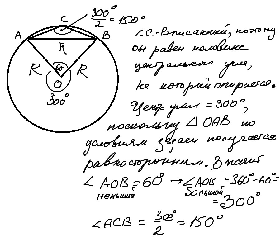 В окружность вписан тупоугольный треугольник АВС. Найдите угол С треугольника, если его наибольшая сторона АВ равна радиусу окружности.