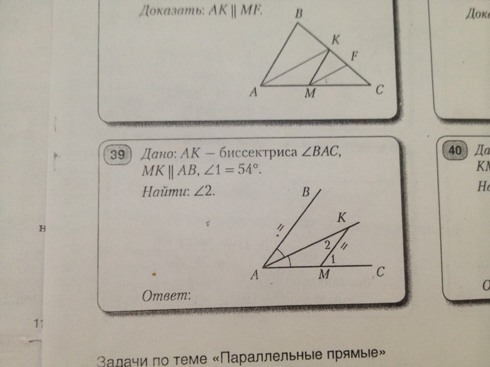 задача 2)ak-биссектриса угла bac, mk//ab, угол 1=54*, найти угол 2