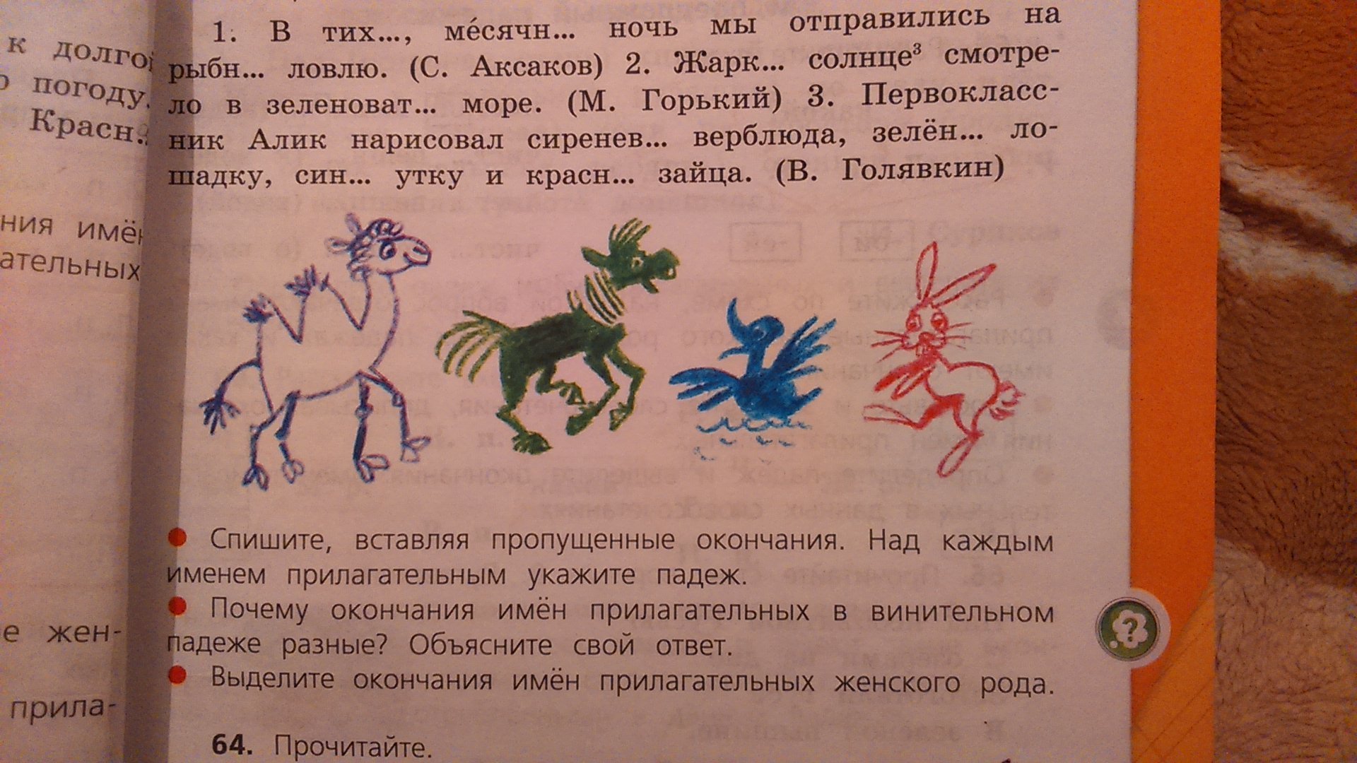 1. В ТИХУЮ (В.п.) МЕСЯЧНУЮ (В.п.) ночь мы отправились на РЫБНУЮ (В.п.) ловлю. Жаркое (Им.п.) солнце смотрело в зеленоватое (В.п.) море. Первоклассник Алик нарисовал сиреневого (В.п.) верблюда, ЗЕЛЁНУЮ (В.п.) лошадку, СИНЮЮ (В.п.) утку, красного (В.п.) зайца.