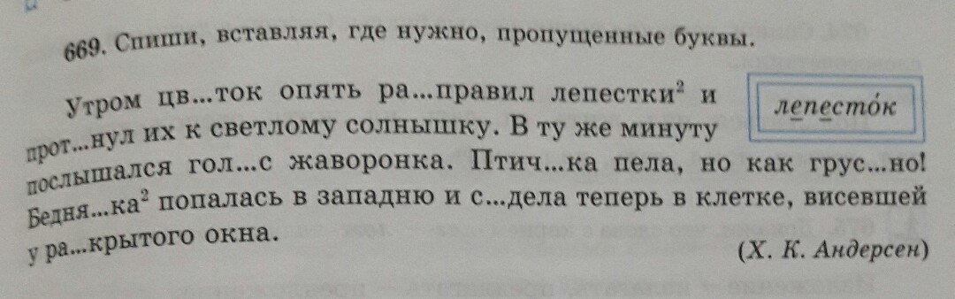 Утром цветок опять расправил лепестки и протянул их к светлому солнышку. В ту же минуту послышался голос жаворонка.Птичка пела,но как грустно! Бедняжка попалась в западню и сидела теперь в клетке,висевшей у раскрытого окна.