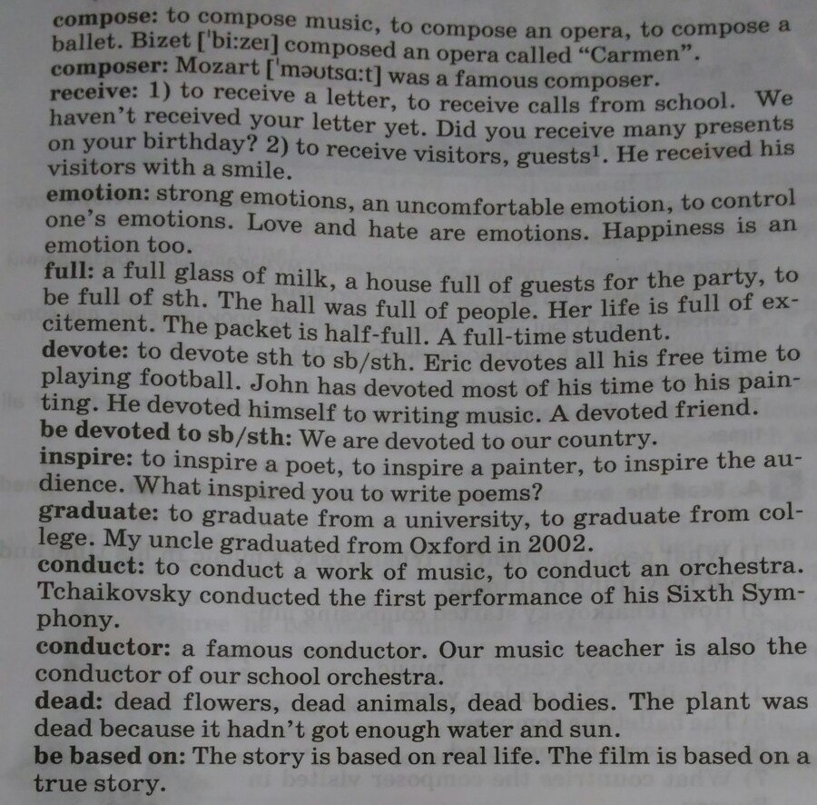 составляют: сочинять музыку, сочинять оперу, сочинить к балету. Бизе bizeilcomposed оперу под названием "Кармен композитор: Моцарт Imautsa:. Т] был известный композитор получит письмо, чтобы получить из школы мы не получили Ваше письмо еще Получили ли вы много подарков посетителям принимать посетителей, гостей он получил. . его улыбка эмоции:. сильные эмоции, неудобной эмоции, контролировать свои эмоции, любовь и ненависть эмоции Счастье эмоция быть полный полный стакан молока, дом, полный гостей за до зала был полон полон. ех людей. Ее citement. пакет наполовину полон. студент полный рабочий день, играя посвятить н С.Б. / н. Эрик время футбола. Джон посвятил большую часть своего времени к его боли тин. Он посвятил себя писательской . музыка посвящена С.Б. / н: Мы преданы нашей стране преданного друга вдохновляют:., чтобы вдохновить поэта, чтобы вдохновить художника, чтобы вдохновить Au ience Что вдохновило вас писать стихи выпускник:.? окончить университет, окончить Col Lege Мой дядя окончил Оксфордский в 2002 году поведения:. провести работу музыки, вести оркестр Чайковский провел первое исполнение его шестой сымских пустышками. дирижер: известный дирижер. Наш учитель музыки также й дирижер нашего школьного оркестра. мертвые: мертвые цветы, мертвые животные, мертвые тела. Завод ва мертв, потому что он не получил достаточного количества воды и солнца. быть основаны на: История основана на реальной жизни. Фильм основан на реальной истории.